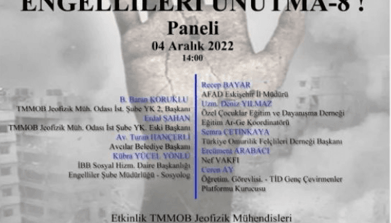 TMMOB Jeofizik Mühendisleri Odası İstanbul Şubesi her yıl engelli vatandaşların toplumsal yaşam yanında afet hazırlıklarında da unutulmaması gerektiği inancıyla geleneksel olarak uyguladığı “Afete Hazırlıkta Engellileri Unutma” panelinin sekizincisini 04 Aralık 2022 Pazar günü gerçekleştirdi.