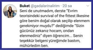 “Seni de unutmadım, derste “Evrim teorisindeki survival of the fittest ilkesine göre benim doğal olarak seçilip elenmem gerekmiyor muydu?” dediğimde “Sizin gücünüz zekanız hocam, ondan elenmediniz” diyen öğrencim… Senin teşekkür belgeni yüreğimde bastım, mühürledim ben,” diye tweet atmıştınız. Öğrencilerinizle aranız nasıl?