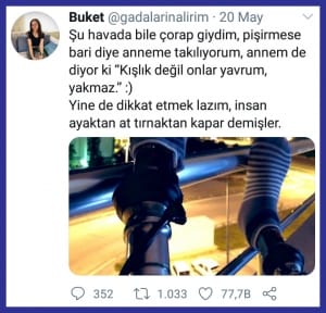 Çok teşekkürler. Okuyanların beni ya da ayaklarımı değil, içimdekileri görmeleri hoşuma gidiyor aslında. Engelli biri olarak tanınsam da bu niteliklerim için takip edildiğimde daha mutlu oluyorum. “Engelli” olmaktan fazlası olmayı hedefledim hep, engelimin benim önüme geçmesine izin vermedim. Çocukluktan beri yazmayı severim, teşvik de ederim, inanılmaz rahatlatır beni duygularımı kelimelere dökmek. Yıllardır da Twitter’da günlük tadında kendimi yazıyordum, az takipçim vardı ve anonimdim. Kimseye söylemezdim kullanıcı adımı ama hazırlıksız bir keşfediliş oldu benimkisi, bazı gizli tweet’lerimi bile silemeden yürüyerek tüm ülkeye ifşa oldum. 🙂 Bunun üstüne artık kendi adımla devam etmeye karar verdim. Şimdi akraba, dost, öğrenci, hatta müdürüm bile takip ediyor, kimsenin arkasından atamıyorum valla. 🙂