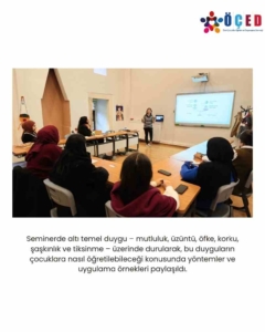 Seminer kapsamında; mutluluk, üzüntü, öfke, korku, şaşkınlık ve tiksinme olmak üzere altı temel duygu ele alınarak, bu duyguların çocuklara nasıl öğretilebileceğine dair yöntemler ve uygulama örnekleri aktarıldı.