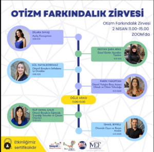 Güzel Günler Ajandası Sosyal Sorumluluk Projesi kapsamında Otizm Farkındalık Zirvesi’ne gönüllü uzmanlarımız ile konuk olduk. Açılış konuşmasını Uzman Klinik Psikolog, Öğretim Görevlisi Dilara Savaş’ın yaptığı ve Güzel Günler Ajandası’nı tanıttığı zirvede ÖÇED Başkanı Parin Yakupyan Otizmli Yetişkin Birey Annesi Olmak,” Psikolog, ABA Eğitim Koordinatörü Elif Sanal Çalık ‘Otizmli Bireylerin Eğitimde Yaşadığı Sorunlar ve Çözüm Önerileri’, Psikolog ABA Koordinatörü İsmail Bıyıklı ‘Otizmde Oyun ve Resim Analizi’ başlıklar ile sunumlar yaptılar. Tohum Otizm’den Gül Hayal Korkmaz “Otizmli Bireylerin İstihdamında Başarı Öyküleri” sunumunu paylaştı. ZOOM üzerinden gerçekleşen zirve öğrenciler ve ailelerin yoğun katılımı ile gerçekleşti.