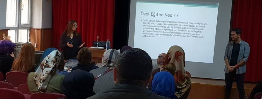Ümraniye Mehmet Akif İnan Ortaokulu’nda “otizm ve kaynaştırma aile eğitimi” verildi. Özel eğitim öğretmeni Hakan Saday ve ÖÇED Yönetim Kurulu Başkanı ve otizmli birey annesi Parin Yakupyan’ın konuşmacı olarak katıldığı eğitimde, “Otizm ve farklılıklara bakış açısı nedir, çevreye düşen sorumluluklar nelerdir, farkındalık ve toplum desteği neden önemlidir, kaynaştırma genel olarak nedir, kaynaştırmanın otizmli çocuğa, normal gelişen diğer çocuklara ve öğretmenlere faydası nedir?” başlıklarında bir seminer verildi. Seminere sınıfında otizmli çocuk olan öğretmenler ve veliler katılım gösterdi. Seminerden sonra veliler memnuniyetini dile getirdi.
