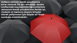 Basında okuduklarımdan sonra bu konuda aslında normal gelişim gösteren öğrenciler kadar onların velilerinin de bilgilendirilmesi gerektiğini düşünüyorum. Gözlemlediklerim, bazı velilerin ne yazık ki inanılmaz derecede ayrıştıran ve bazen acımasız davranışlarda bulundukları yönünde. Velilere otizmin kendi çocuklarına zarar verecek bir şey olmadığı, aksine sınıflarında kaynaştırma öğrencilerinin olmasının kendi çocuklarının ileride iyi, vicdanlı ve topluma duyarlı bireyler olarak yetişmeleri için büyük bir fırsat sunduğu anlatılmalıdır.