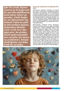 Camdan sarkacak gibi olduğunda da katı ve yönlendirici bir tavır gerekir. Karşımızda bir erişkin değil, iletişim sorunları yaşayan bir çocuk var. Elbette sevgimiz ve anlayışımız olacak, ama bazen otoritenin devreye girmesi şart. Örneğin, birçok aile şunu dile getirir: “Evde huysuz, okulda melek gibi.” Bu durumu açıklayan tek bir şey var: çocuk, sizinle olan ilişkisinde sınırları esnetiyor. Okulda ne oluyor ki? Eline sopa almış bir öğretmen mi var? Hayır. Orada sadece sesini duyurmayı bilen bir öğretmen ve belli kurallar var. Eğer çocuk okulda uyumlu, evde huzursuzsa, sorun çocukta değil bizde. Hata, çocuğun huysuzlanmasına taviz vermemizde yatıyor.