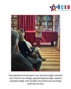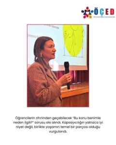 Seminerde, öğrencilerin aklından geçebilecek “Bu konu benimle neden ilgili?” sorusu üzerinden kapsayıcılığın yalnızca iyi niyet değil, birlikte yaşamın temel bir parçası olduğu vurgulandı. Özel gereksinimli bireylerin ayrı alanlara değil, herkesle aynı ortama ait olduğu; gerçek kapsayıcılığın yalnızca yasal düzenlemelerle değil, sınıf içindeki tutum ve davranışlarla inşa edildiğinin altı çizildi.