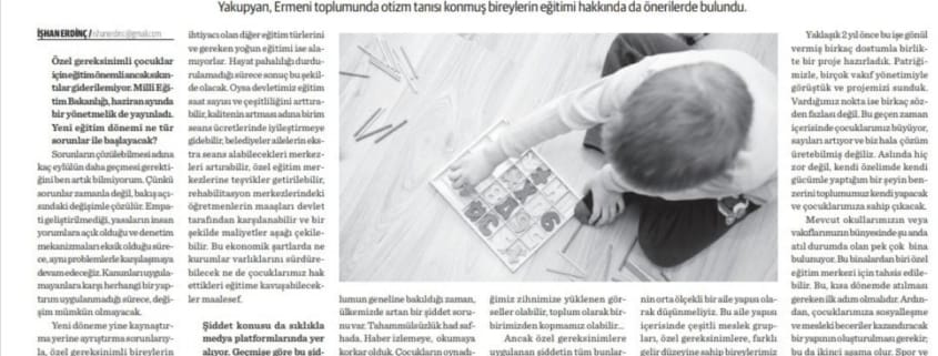 Ermeni toplumunu bu ülkenin orta ölçekli bir aile yapısı olarak düşünmeliyiz. Bu aile yapısı içerisinde çeşitli meslek gruplarına, özel gereksinimlere, farklı gelir düzeyine sahip bireylerimiz bulunuyor. Amacımız, ailemizde bulunan özel gereksinimli bireylerin eğitim süreçlerini sağlıklı bir şekilde sağlayarak, onları topluma kazandırmak olmalı. “Bu hayattaki sorumluluğumuz sadece kendi doğurduklarımızdan ibaret olmamalı” değil mi? Eğer cemaatimizde özel gereksinimli bireylerimiz varsa ve her geçen gün bu sayı artıyorsa daha ne kadar onları görmezden gelebiliriz? Farklı vakıf ve dernek oluşumlarımız var, okullarımız var, hastanelerimiz var. Neden bir özel eğitim merkezimiz olmasın? Bu toplumumuzun en önemli ihtiyaçlarından biri. Biz cemaat olarak bunu yapabilecek güce sahibiz, bundan hiç kuşkum yok. Buna inancım tam. El birliği ve dayanışma içerisinde bir merkez açabileceğimiz kanısındayım. Bu konuda aceleci olmamız, toplumumuza olan borcumuzdan kaynaklanıyor. Hayata kazandıramadığımız her birey için ileride daha fazla çaba sarf etmek zorunda kalacağız. Bu aile yapımızın, toplumumuzun, ülkemizin, dünyamızın gerçeği. Soruyorum, küçük yaşta eğitim veremediğimiz çocuklarımıza ileride aileleri bakamaz duruma geldiğinde ne yapacağız? Yaşlılar için huzurevimiz var değil mi? Peki, bu topluma kazandırılamayan çocuklar ne olacak?