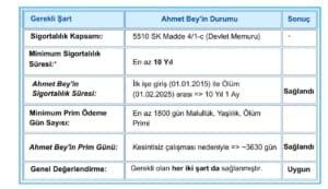 - Devlet memuru olan Ahmet Bey, ölüm aylığı için gerekli olan 10 yıl sigortalılık süresi ve 1800 prim günü şartlarının her ikisini de sağlamaktadır.