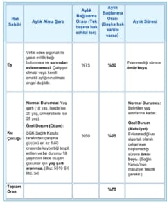 - Hak Sahipleri (Eş ve Çocuk) Yönünden Şartlar ve Aylık Oranları: