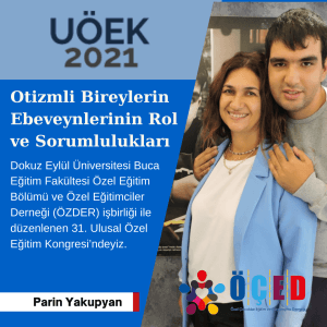 22-23-24 Ekim 2021 tarihleri arasında online olarak gerçekleştirilecek kongrede, 23 Ekim Cumartesi 16:05 – 17:05 arasındaki oturumda yer alıyoruz. ÖÇED Başkanı Parin Yakupyan ve Dr. Öğretim Üyesi Didem Güven ile Otizmli Bireylerin Ebeveynlerinin Rol ve Sorumlulukları sözel bildirisini sunacağız.